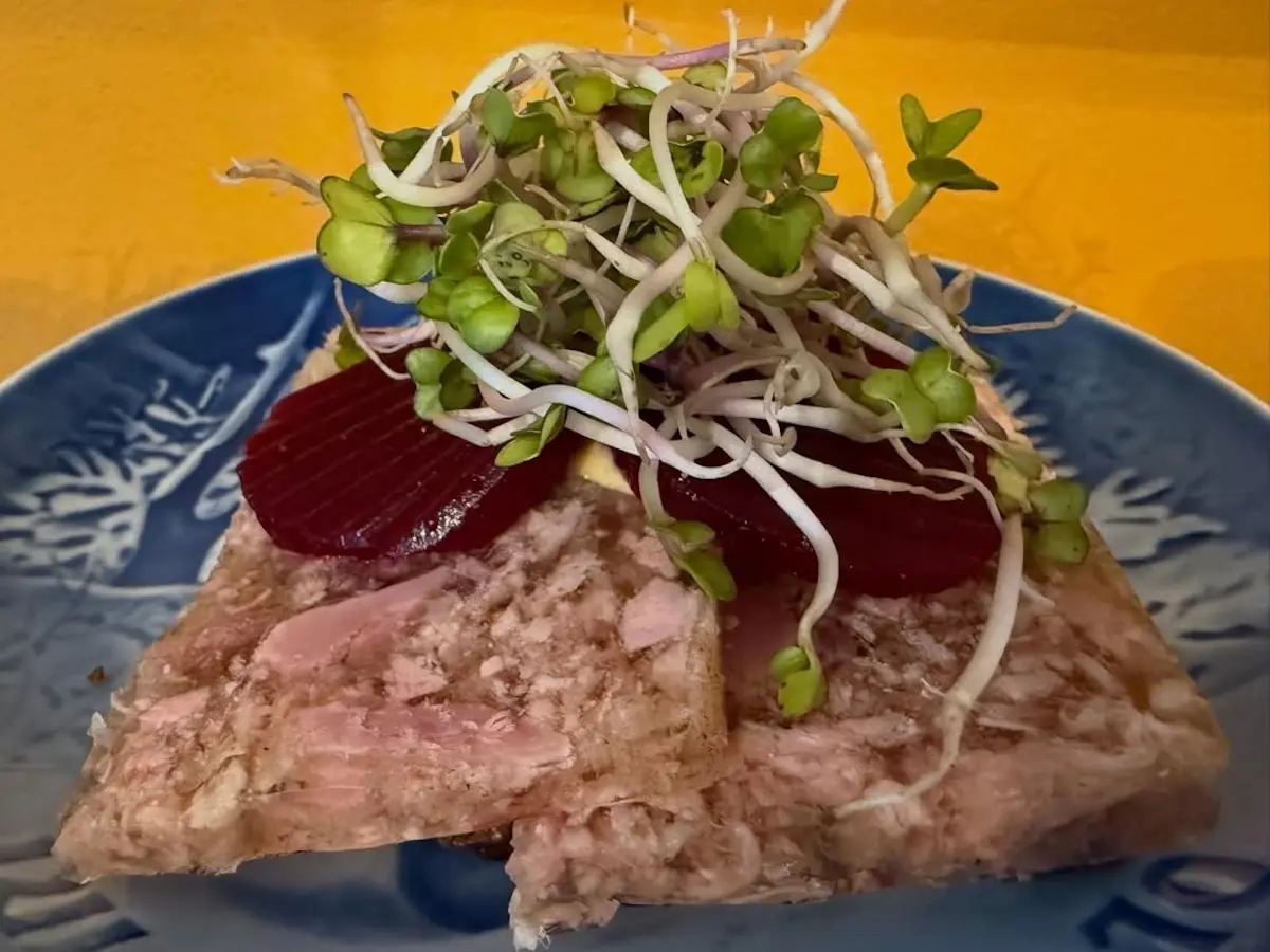 Vores signaturstykke med syltet agurk, syltet rødløg, råsyltet bøgehat, sprødt bacon og karse.