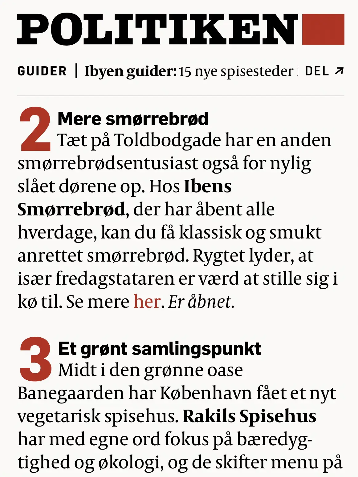 Selvom Ibens Smørrebrød er Danmarks mindste smørrebrødsrestaurant, bliver vi indimellem omtalt i danske og internationale medier. Her kan du se nogle af dem.
