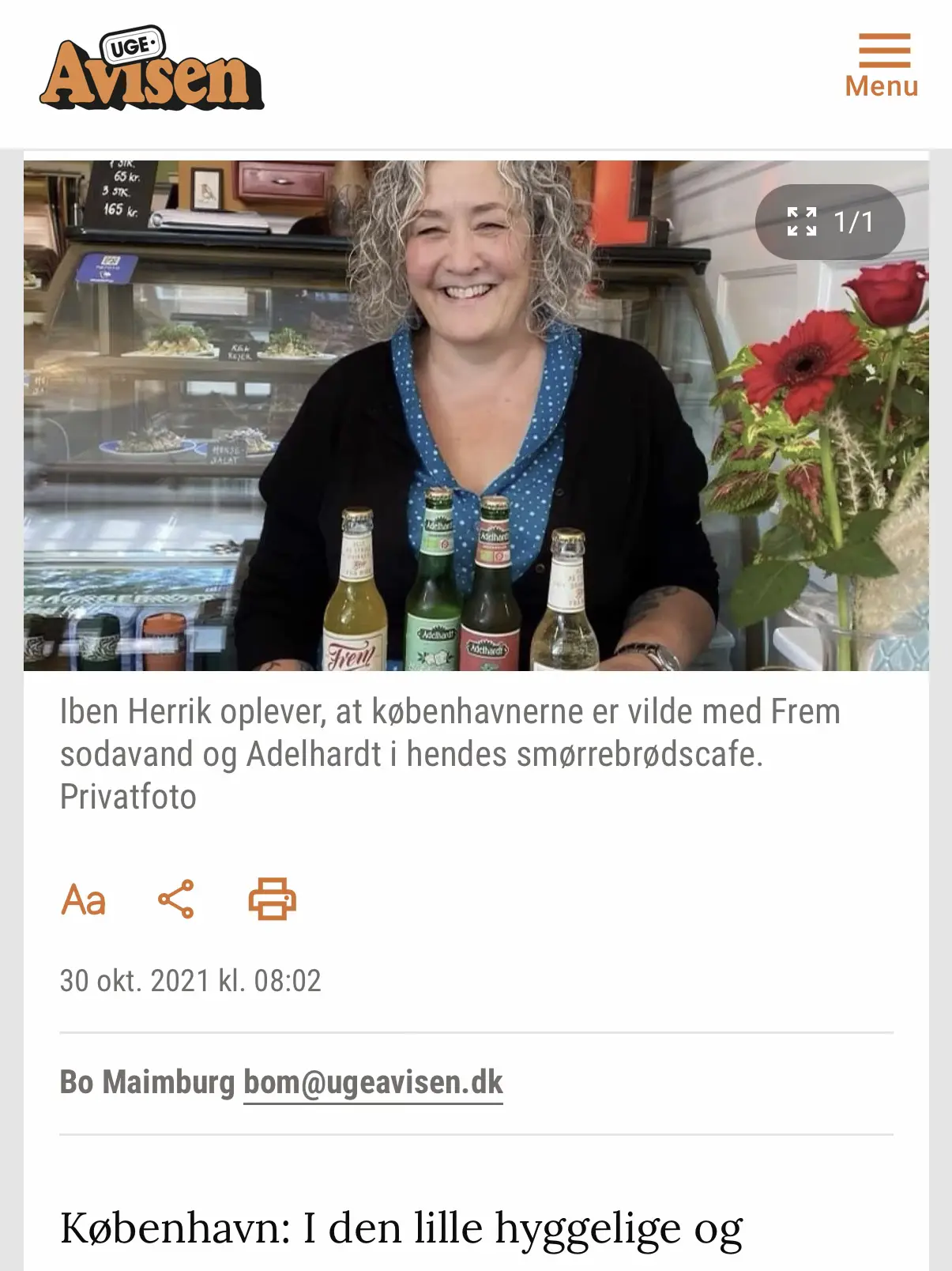 “I den lille hyggelige og eksklusive smørrebrødscafe, Ibens Smørrebrød får man serveret Frem-sodavand og Adelhardt-safter”